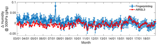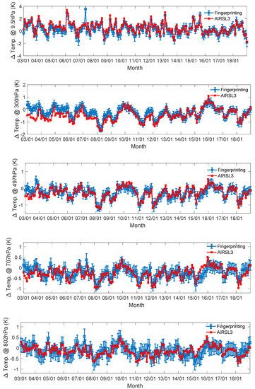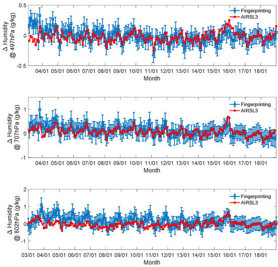Drifts/offsets in the AIRS radiances can introduce errors in both the retrieval and the fingerprinting results. AIRS Level 3 products are generated using the physical retrieval Level 2 algorithm with a cloud-clearing algorithm and a neural-network first guess trained from the numerical weather prediction (NWP) models. The fingerprinting is constructed from the PCRTM based physical retrieval that uses the climatology background as the constraint. The latter constraint is more relaxed so that the fingerprinting results can be more sensitive to the radiance errors. AIRS is a grating spectrometer with known drifts in the AIRS channel centroid frequencies and the Doppler shifts in the AIRS radiances due to the rotation of the Earth seen from the Aqua spacecraft. The AIRS radiance data used in this paper are the AIRS L1C data of version 6 [38]. The frequency shift correction is not applied to this version of AIRS data. Strow et al. [39] characterized the cause of the frequency shifts in AIRS measurements that occurred at different stages of the operation. There are slow detector position drifts in most of the AIRS modules that gradually stopped in 2009. After 2009, there are two kinds of drift patterns: a seasonal variation drift and an orbit phase dependent drift. Both drifts experienced a step change in the magnitude in early 2014, potentially due to the March 2014 AIRS shut down in modules that measure the water bands. Those shift patterns mean that the characteristics of the AIRS spectral error can be systematically different for three different time periods: before 2009, 2009–2014, and 2014–2018. The corresponding impacts on the fingerprinting of temperature and water vapor are therefore different for three time periods. The relatively larger frequency shift errors before the year 2009 lead to larger errors in the fingerprinting of both temperature and water vapor, as is shown in Figure 12 and Figure 14. The water vapor anomaly at 802 hPa from the fingerprinting and that from the AIRS Level 3 results are systematically different before 2014 but in good agreement after 2014, which also coincides with the change of the frequency shift pattern in early 2014. The fingerprinting scheme is constructed using the physical retrieval results of 2016 and 2017 so that the AIRS spectral errors after 2014 are better accounted for in the fingerprinting uncertainty matrix. In general, there is a systematic correlation between the characteristics of the AIRS frequency shift and the fingerprinting errors, which indicates that a significant part of the fingerprinting errors can be caused by the errors in AIRS spectral radiances.
