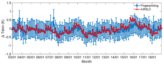 Similar to Figure 12 but demonstrates the comparison between surface skin temperature anomaly obtained from the fingerprinting study and that from the AIRS Level 3 products.