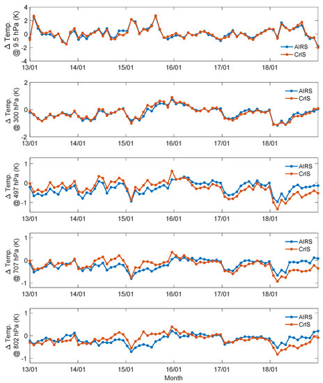 where is the standard deviation value of the CrIS-AIRS difference (lag-0 uncertainty) and is the corresponding autocorrelation time. and are the standard deviation value and the autocorrelation time associated with natural variability, respectively. If the CrIS and AIRS results are perfectly consistent, the trend uncertainty will be solely determined by the natural variability variance factor and the length of the detection time. here defines the ratio of trend uncertainty introduced by both the CrIS-AIRS measurement difference and the natural variability to that only introduced by the natural variability. For example, means that the CrIS-AIRS measurement inconsistency increases the trend uncertainty by 20% as compared with the trend accuracy established from perfect measurements. By using the AIRS Level 3 data products (shown in Section 4.2) as the reference to estimate and , we can evaluate the impact of CrIS-AIRS measurement uncertainty on the temperature and water vapor trends at different altitudes. The results are listed in Table 2. The parameters and are obtained by fitting the CrIS-AIRS differences and the AIRS anomaly time-series data to corresponding autoregressive and moving average models using the approach in [28]. From Table 2, we can see that measurement uncertainty factor for atmospheric temperature and water trends detection is the lowest at 300 hPa. This is in line with the excellent agreement in the temperature and water vapor anomalies at 300 hPa between CrIS and AIRS shown in Figure 16 and Figure 18. Such a good agreement between CrIS and AIRS results suggests the feasibility of building continuous long-term data records of temperature and water vapor anomalies at 300 hPa through the fusion of data from multiple hyperspectral sensors. The impact of CrIS-AIRS anomaly differences on both the stratospheric temperature and the surface skin temperature trends is relatively insignificant. However, the impact becomes larger in the lower tropospheric region and can increase the trend uncertainty by more than 100%. This also illustrates the fact that the fingerprinting errors are larger in the mid-to-low altitude region because of the limited sensitivity of the IR measurements to the radiative contribution from below clouds.