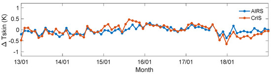 Similar to Figure 16 but demonstrates the comparison between surface skin temperature anomaly obtained from the AIRS spectral anomalies and that from the CrIS spectral anomalies.