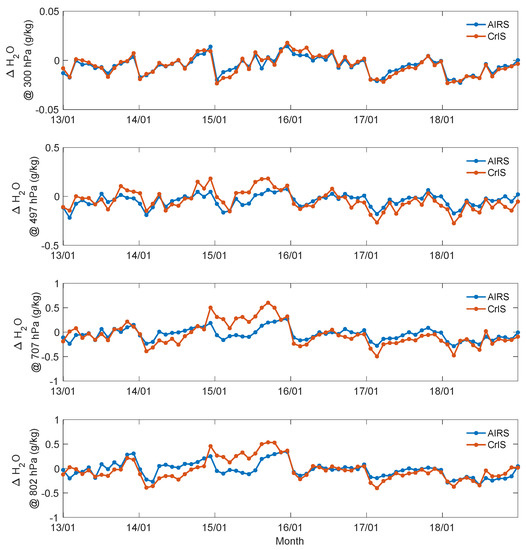 Similar to Figure 16 but compares the specific humidity anomalies at various altitudes from the AIRS spectral anomalies and those from the CrIS spectral anomalies.