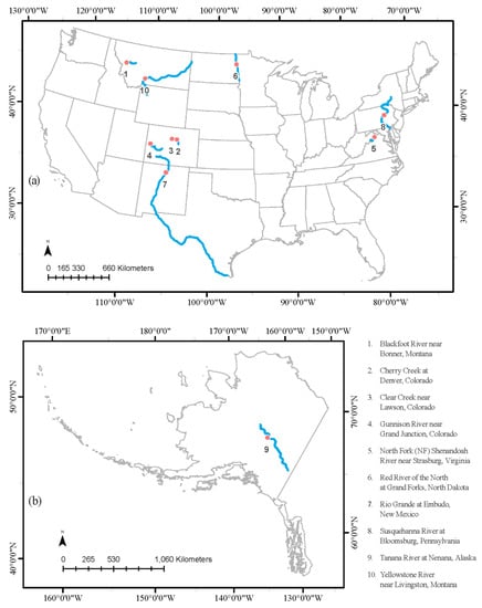 - Eberts, S.; Woodside, M.; Landers, M.; Wagner, C. Monitoring the Pulse of our Nation’s Rivers and Streams—The U.S. Geological Survey Streamgaging Network; U.S. Geological Survey Fact Sheet 2018–3081; 2018. Available online: https://pubs.er.usgs.gov/publication/fs20183081 (accessed on 19 April 2020).