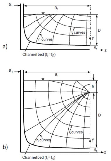 Location of the y-axis and maximum velocity and maximum surface velocity in a channel cross section defined by the x-h orthogonal coordinate system [66], when (a) h0 and (b) h30. (y = incremental distance from the channel bottom to water surface; D = total distance from the channel bottom to the water surface at the y-axis; y-axis = the vertical in a cross section that contains the maximum velocity; h = distance from the water surface to the maximum velocity, umax; h = orthogonal trajectory of x; x = dimensionless coordinate related to velocity and h; ξ0 is the value of ξ in the point (or points) where the velocity u = 0; Bi = top-half width of channel).