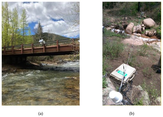 Photographs of typical radar deployments from (a) bridge along Clear Creek near Lawson, Colorado, and (b) cable stays in Waldo Canyon, Colorado, USA.