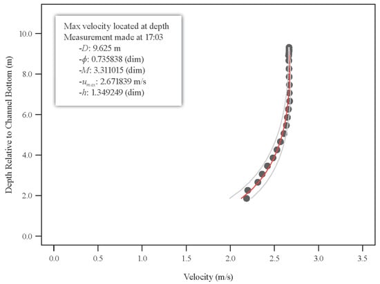 The parameter ϕ which is a function of M, can be computed using two methods. First, point velocities are measured along the y-axis beginning near the channel bed and extending to the water surface. An R-script was developed to compute umax, M(ϕ), and h/D by incorporating the depth and velocity data recorded by conventional instruments. The “nls” algorithm [88,89] is a nonlinear (weighted) least-squares estimator of the parameters umax, M(ϕ), and h/D. By default, Equations (6) and (7) are solved using a Gauss–Newton nonlinear least-squares method. A typical velocity profile located at the y-axis is illustrated in Figure 4 for the Tanana River at Nenana, Alaska. Second, historical pairs of mean and maximum velocities are plotted, where ϕ represents the slope of the pairs and is the preferred method for computing ϕ [74,75] and is represented by Equation (9):