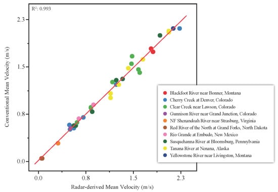Subsequent validation visits were conducted at each of the 10 USGS streamgages to collect event-based instantaneous measurements. Figure 5 summarizes the results of 36 site visits (10 siting and 26 validation) and demonstrates general agreement between radar and conventional mean velocities. The average and absolute percent error was computed for the Blackfoot River (−1.4% and 2.5%), Cherry Creek (1.1% and 5.6%), Clear Creek (2.1% and 6.9%), Gunnison River (4.9% and 4.9%), NF Shenandoah River (−8.0% and 8.0%), Red River of the North (−8.6% and 8.6%), Rio Grande (4.6% and 4.6%), Susquehanna River (−0.4% and 3.8%), Tanana River (−2.5% and 3.9%), and Yellowstone River (−0.7% and 0.7%). The composite average and absolute percent error of all 36 site visits was −0.3% and 5.1%. The data show strong agreement (correlation coefficient, R2, equal to 0.993) between instantaneous radar-derived and conventional mean velocities (Figure 5).