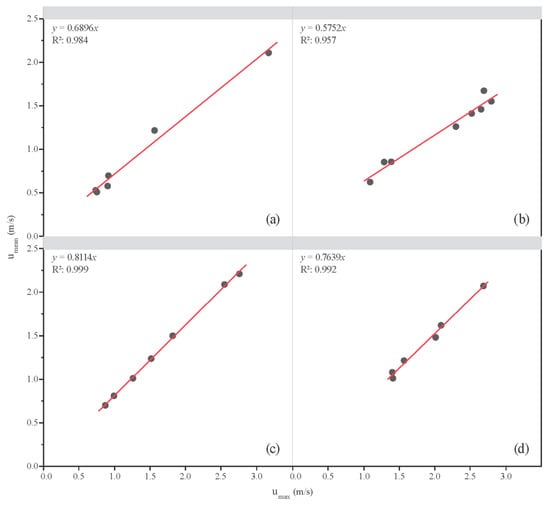 Historical pairs of mean (umean) and maximum (umax) velocities obtained during site visits at (a) Cherry Creek at Denver, Colorado, (b) Clear Creek at Lawson, Colorado, (c) Susquehanna River at Bloomsburg, Pennsylvania, and (d) Tanana River at Nenana, Alaska, where velocity radars were deployed by the U.S. Geological Survey (USGS) and collocated with USGS streamgages in the United States. (R2 = correlation coefficient, dim; m/s, meters per second; y = mean velocity = umean, in m/s; x = maximum velocity = umax, m/s; 0.6896, 0.5752, 0.8114, 0.7639 = slope = ϕ = umean/umax).