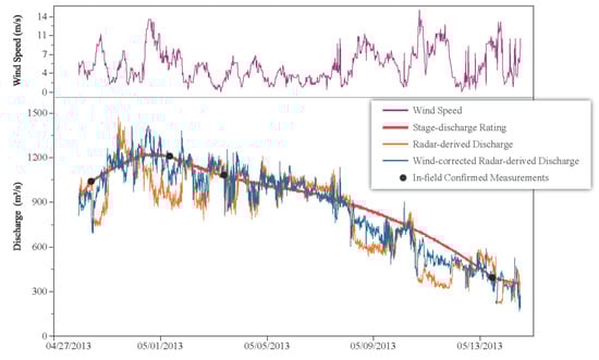 Wind-corrected discharge can be computed for sites where the surface velocity is affected by wind. The correction (1) relies on measurements from a wind sensor located at a nominal height (10 m) above the water surface and adjacent to the radar, (2) assumes a vertical wind profile based on the Prandtl von Karman (PvK) velocity distribution equation, and (3) assumes a surface-roughness height for water equal to 0.01 cm [78]. Wind-drift corrections are based on the measured wind speed and direction recorded by the sensor every 15 min and are temporal with velocity and stage data. A theoretical wind speed can be computed near the water surface using the PvK distribution and a roughness height of 0.01 cm. Based on the orientation of the river reach (e.g., azimuth equal to 130 degrees), the resultant wind vector can be subtracted from the surface velocity if the winds are concordant (in the direction) of streamflow. If the winds are counter (in the opposite direction) to streamflow, wind velocity is added to the surface velocity.