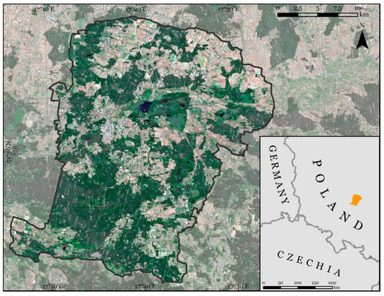 Study area of the Milicz Forest District located in south-western Poland. Sentinel-2 image from 30 June 2019, in natural band composition.