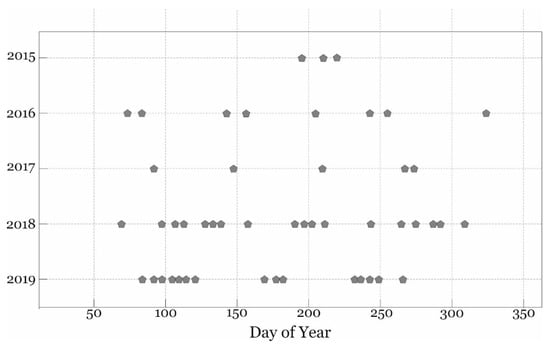 The Sentinel-2 imagery was downloaded from the Copernicus Open Access Hub repository using the sen2r package in R [54]. All of the available Sentinel-2 data from the years 2015–2019 (tile number: 33UXT), with a cloud cover below 10%, were downloaded and further processed, excluding winter imagery. In total, we used 49 images, acquired between 11 July 2015, and 23 September 2019 (Figure 2).