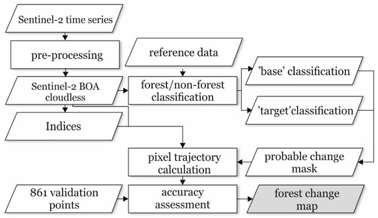To achieve the objectives of the study, the following steps of analysis were performed: (i) The Sentinel-2 data were downloaded and pre-processed, including sen2cor correction, vegetation indices (VI) calculation, and cloud masking; (ii) “base” and “target” classifications were created, and their accuracy was assessed; based on these classifications, (iii) mask of probable change was generated; (iv) the spectral trajectories of the Sentinel-2 bands and indices were calculated for all the pixels in the area of probable change; (v) the accuracy of the detected changes was assessed using 861 validation points; and (vi) a forest change map was created, based on the highest accuracy change detection (Figure 3). All of the abovementioned steps were performed in R [55].