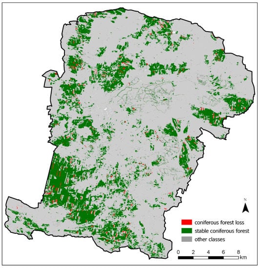The forest mask for 2015 covered approximately 158.2 km2, and that for 2019 covered approximately 158.4 km2. The potential change mask, where a change from coniferous forest to any non-coniferous class occurred, covered 4.95 km2, which equals 49,511 pixels (Figure 4). The increase of forest mask by 0.2 km2 indicates that the forest cover gain is also observed within the study area, and it is higher than forest cover loss. However, the main interest of this study was to analyze the areas where the loss of coniferous forests occurred.