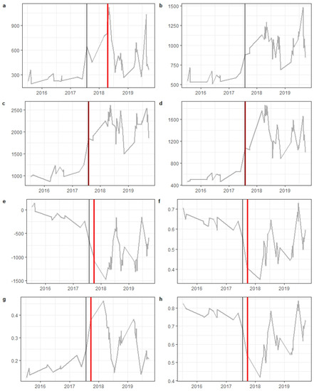 The example of spectral trajectories for a selected pixel, where all bands and indices provided correct change date: red vertical lines—detected break dates, black vertical line—real change date.; (a) VIS R, (b) RE1, (c) SWIR1, (d) SWIR2, (e) TCW, (f) NDMI, (g) MSI, (h) NBR.