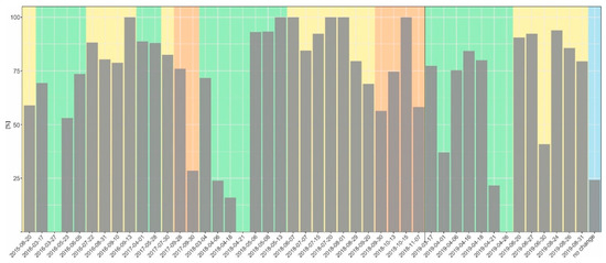Macro-averaged F1 score for the best detection map (SWIR1). Spring months highlighted in green, summer—yellow, autumn—orange.