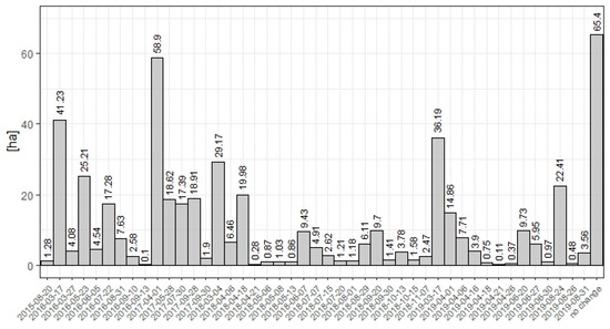 Based on the best detection in terms of accuracy (SWIR 1), we produced changes map in coniferous forest stands for the Milicz Forest District. Out of the 49,511 pixels, the breakpoints were detected for 42,971, which equals an area of the changes of 429.7 hectares (Figure 9). The most numerous changes were detected in the spring months, with the largest change area detected on 2017/04/01, which was equal to nearly 59 hectares, followed by that on 2016/03/17 (41 ha) and that on 2019/03/17 (36 ha). Regarding the annual changes in each examined year, starting from 2016, the changes exceeded 100 hectares, with the maximum area of the changes in 2017 equaling 115.7 hectares.