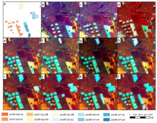 Part of the forest changes map based on pixel trajectory analysis (a) and selected Sentinel-2 time series: (b) 2016-07-22, (c) 2016-09-10, (d) 2017-04-01, (e) 2017-05-28, (f) 2018-05-06, (g) 2018-05-08, (h) 2018-05-13, (i) 2018-06-07, (j) 2018-07-07, (k) 2018-07-15, (l) 2018-07-20.