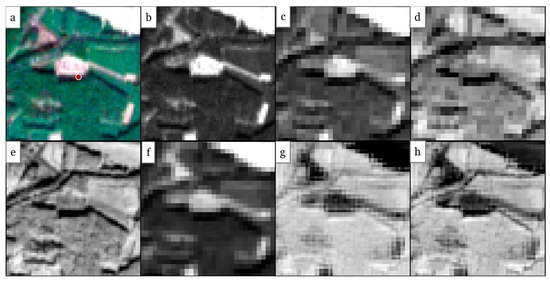 Part of the Scots pine stands with deforestation example seen on image from 17 March 2016: (a) Sentinel-2 image in true color composition; (b) Red; (c) RE1; (d) RE2; (e) NIR1; (f) SWIR1; (g) TCW; (h) NDMI. The example pixel (red dot on true-color composition) was correctly detected using both indices but falsely detected using single bands as a change from 27 March, which was the consecutive date in the Sentinel-2 time series.