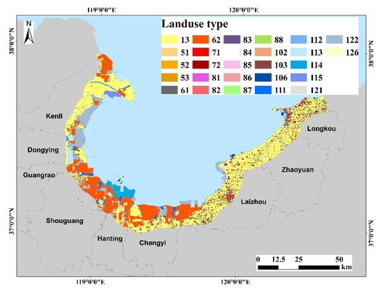 Interpretation results of land use in Laizhou Bay. Land-use types: 13 = arable land; 51 = wholesale and retail area; 52 = accommodation and dining area; 53 = commercial and financial area; 61 = industrial area; 62 = magnesium mining area; 71 = urban residential area; 72 = rural residential area; 81 = government and organization area; 82 = press and publication area; 83 = campus; 84 = medical area; 85 = sports and recreation area; 86 = land for public facilities; 87 = park and green space; 88 = scenic area; 102 = highway; 103 = road in built-up area; 106 = cargo port; 111 = river; 112 = lake; 113 = reservoir; 114 = pit pond; 115 = tidal flat; 121 = under construction; 122 = salt field; 126 = bare land.