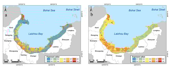 Exposure of the coastal zone of Laizhou Bay: (a) Land-use type exposure; (b) Exposure after considering the natural environment.