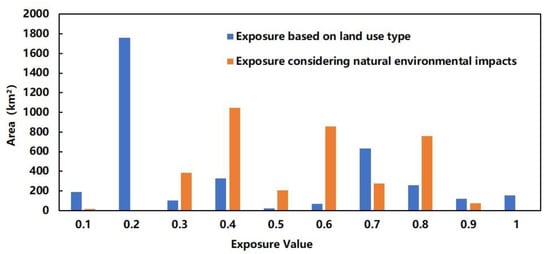 It can be seen from Figure 4 and Figure 5 that after considering the natural environment factors, the exposures of the land-use types changed significantly. The areas of low-exposure and high-exposure land-use types decreased significantly, while the area of moderate exposure increased to a certain extent after adding the impact of the natural environment. The main reason for these changes is that before considering the impact of the natural environment, the exposure is only related to the type of land use, and the areas of different exposures directly reflect the areas of the corresponding land use type. When considering the impact of the natural environment, however, exposure becomes a comprehensive indicator that includes both land-use type and environmental impact. Only for cases in which land-use types and the environment simultaneously have low or high exposure will the final result have either low or high exposure; otherwise, it is more likely to exhibit moderate exposure. For example, when the environmental impact is not considered, the land-use type with an exposure of 0.2 in the Laizhou Bay area covers a large area, which is mainly due to the large amount of arable land. Most of the arable land in the Laizhou Bay area, however, is located in low-lying and gentle slope regions, and the natural environment is more exposed. Therefore, after taking into consideration the impact of the natural environment, the comprehensive exposure increases. Ultimately, the area of the disaster-bearing bodies with an exposure of 0.2 was greatly reduced. In summary, after considering the impact of the natural environment, the conditions that produce low exposure and high exposure become more severe, and in this case, attention needs to be focused on features that still exhibit high exposure.