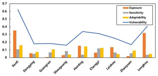 After generating the weights of all of the indicators, the vulnerability levels of the nine assessment units were calculated. The results of the exposure indices, sensitivity indices, adaptability indices, and vulnerability indices are illustrated in Figure 6. In the coastal area of Laizhou Bay, the nine assessment units ranked from high to low vulnerability were as follows: Kenli District, Longkou City, Hanting District, Changyi City, Laizhou City, Guangrao County, Dongying District, Zhaoyuan City, and Shouguang City.