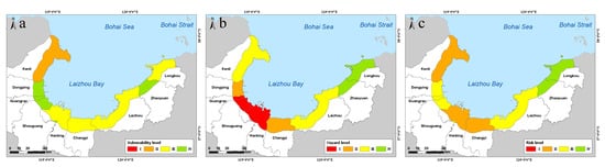 Assessment results for Laizhou Bay: (a) Vulnerability; (b) Hazard; (c) Risk.