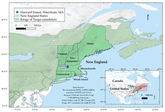 Map of the study region showing the range of eastern hemlock (Tsuga canadensis) in the northeastern United States and southern Canada. Data on water bodies is acquired from Pekel et al. [16], and the range of T. canadensis is from Little [17,18].