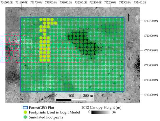 Simulated GEDI footprint locations within the ForestGEO plot, rendered in WGS-84 UTM 18N. They are overlaid on a 1 m canopy height map derived from the G-LiHT 2012 ALS data [35]. The 35 hemlock dominated footprints that were assessed for mortality in 2016 and used in the lasso logistic regression (logit model) are highlighted.