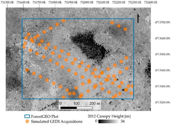 Lastly, waveforms were simulated over the site with both the sparse spatial coverage and average noise parameters of GEDI’s beams. Simulated GEDI tracks were acquired for the Harvard Forest region [12], and a set of 80 footprints (Figure 3) that intersected the study site were selected for further analysis. Footprint locations were spaced to mimic GEDI’s spatial coverage in the ForestGEO plot. Waveforms were simulated from the G-LiHT 2012 and NEON 2016 ALS data at these realistically spaced footprint locations. In addition, realistic noise was added to the waveforms using the estimated parameters of the link margin for GEDI’s power beam at night (link margin = 4.956 at 95% canopy cover) and coverage beam during the day (link margin = -2.039 at 95% canopy cover).