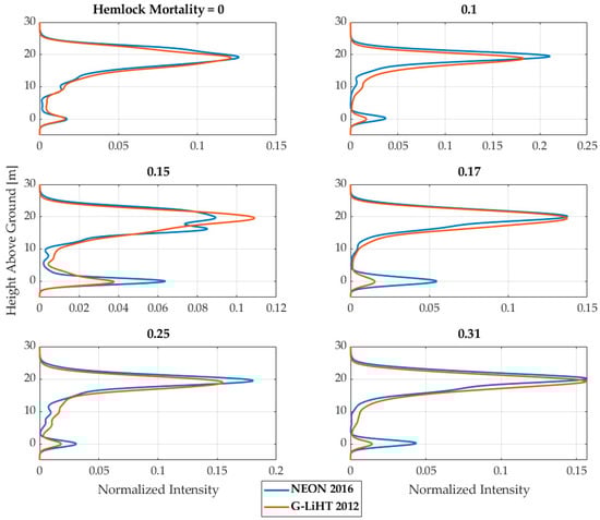 Waveforms were simulated for 2012 and 2016 in 560 footprint locations along a rectangular grid within the ForestGEO plot. Simulated waveforms that were assessed for hemlock mortality in 2016 were plotted by aboveground height against normalized intensity (Figure 4). The highest peak is characteristic of the forest canopy shape, while the lowest peak identifies the ground.