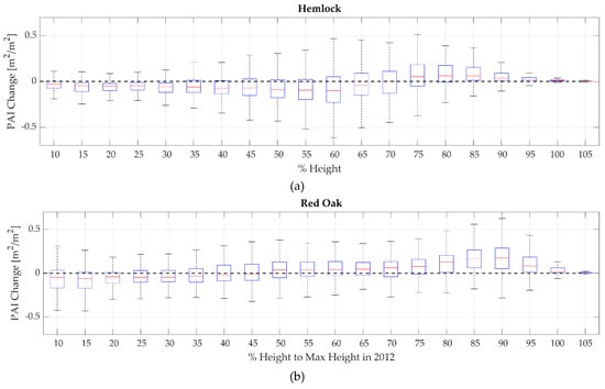 Profiles of hemlock (a) N = 212 footprints and red oak (b) N = 176 footprints PAI change plotted by % height to maximum height in 2012. Boxes show the quartiles and ranges of the distributions. Vertical profiles of PAI Change for footprints dominated by hemlock and red oak follow similar trends in the lower and upper canopy, but hemlock shows a distinct loss of PAI in the mid-canopy (40–70% height).