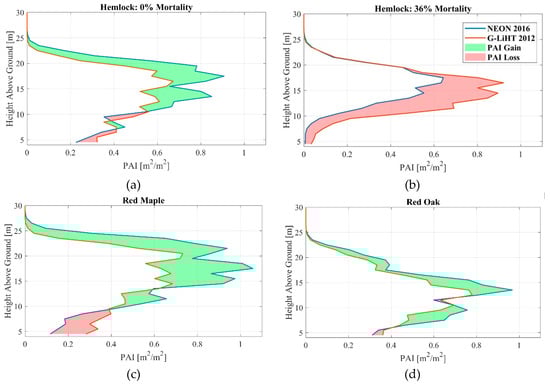 Examples of hemlock (a,b), red maple (c), and red oak (d) PAI change by height. GEDI waveforms were simulated using G-LiHT ALS data in 2012 (orange) and NEON ALS data in 2016 (blue), and vertical profiles of PAI were derived for each year in the same footprint locations. An infested hemlock stand with severe mortality (36%; b) has primarily lost PAI in the midstory and understory, and its overstory shows little change. In contrast, an infested hemlock stand with 0% mortality during the time period (a) displays a pattern of growth similar to that of stands of other tree species, including red maple (c) and red oak (d).