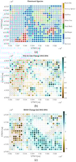 Mid-canopy PAI 11–12 m change showed a loss (brown) in areas dominated by hemlocks, whereas it generally showed an increase (green) or no change (white) in footprints dominated by other tree species (Figure 8a,b). In addition, areas dominated by hemlock trees showed decreases in RH10 between years, while areas dominated by healthy tree species, particularly red oak, showed positive increases in RH10 between years (Figure 8c). Decreases in RH10 in hemlock areas are indicative of increased canopy permeability and foliage loss. In contrast, the increases in RH10 in areas of healthy deciduous trees signify growth and increased canopy cover.