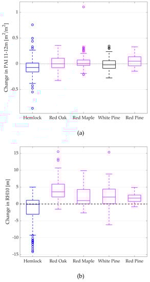 Change in PAI 11–12 m (a) and RH10 (b) by Dominant Species. Boxplots are colored by their significant difference from hemlock (magenta; p < 0.05), as determined by post-hoc tests.