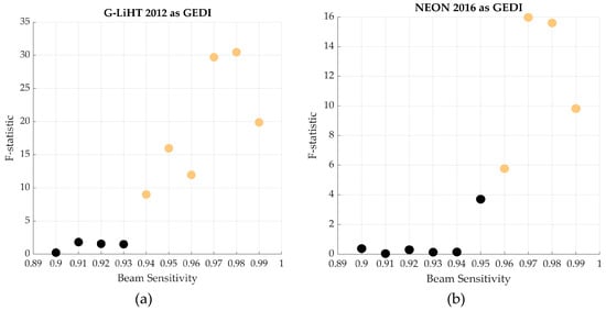 ANOVA with varying beam sensitivities. A series of one-way ANOVA tests tested the effect of species (hemlock and red oak) upon PAI 11–12 m change with added noise. F-test results are plotted against depreciated beam sensitivity values (x-axis), with significant test results (alpha = 0.05) highlighted in orange. Higher beam sensitivities represent waveforms with less noise added, while lower beam sensitivities have more noise. At the 5% significance level, the effect of species as a grouping factor stops becoming significant below a beam sensitivity of 0.94 for G-LiHT data with noise (a) and 0.96 for NEON data with noise (b).
