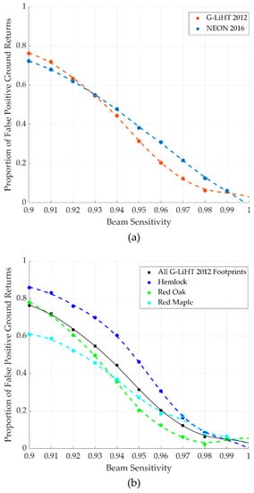 Different species (Figure 11b) also accumulate ground errors at different rates, likely a result of the differences in canopy structural properties (canopy cover, complexity, etc.). With added noise, waveforms over hemlock stands tend to accumulate a higher proportion of false-positive ground returns than do other species, indicating a higher rate of failure to identify the true ground through a complex canopy.