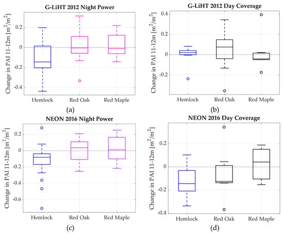 ANOVA with simulated noise and spatial coverage of GEDI data. Boxplots of the quantiles of PAI change at 11–12 m are plotted by species for best (night-power; a and c) and worst (day-coverage; b and d) case scenarios of GEDI’s noise parameters and laser power. Species boxplots are colored by a significant difference from hemlock (magenta; p < 0.05), as determined by Tukey–Kramer post-hoc tests.