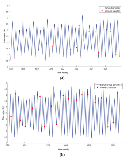 Figure 3 shows the tide heights at Tagus estuary (a) and at Bijagós (b). The red dots are plotted according to S2 acquisition time, which in the image dataset corresponds to 11:21 UTC. It is observed that at the Bijagós, most of the images are acquired during high tide. This could be a limitation on the representation of the intertidal model since the acquired images do not cover accurately the intertidal area dynamics. However, this apparent limitation can be overcome by extending the period of the images acquisition, as in studies that have used 30 years of Landsat images [24].