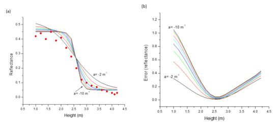 (a) NIR reflectance time series as a function of the tide height (red circles) and adjusted sigmoid function for a range of steepness parameters (from −2 to −10) and (b) cost function for a range of steepness values.