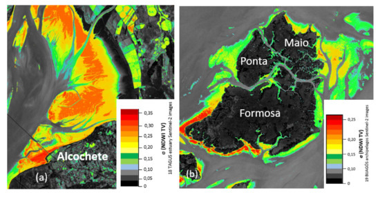 The temporal variability (TV) of the S2 images was computed using the standard deviation of the NDWI. The temporal variability of the NDWI in the northeast of the Tagus estuary and the Formosa, Maio, and Ponta islands at Bijagós, are presented in Figure 7.