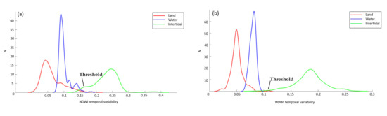 where is the NDWI temporal mean of each pixel (x,y). As the intertidal zone is our area of interest, we used the TV parameter to discriminate 3 different classes of soil occupation—intertidal zone, land (beach berm/dry sand), and water. The intertidal class can be discriminated based on the high TV of the NDWI, as compared to the other two classes. The water class is characterized by a low TV and a high value for the NDWI, when compared with the intertidal zone. The beach berm (land) class has also a low TV, but it is expected that the value for NDWI, contrary to the water class, is smaller than the intertidal zone. The principal and distinguished characteristic of the intertidal zone is a higher TV value. The proposal is to use the TV as a threshold to identify the pixels belonging to the intertidal zone. If there is a slight overlap between classes, the threshold should be selected maximizing the number of intertidal pixels. The selected pixels in the intertidal zone or nearby are considered as candidate pixels for the next phase—the logistic regression analysis. If some overlap between the three classes exists, some water and land pixels will also be considered as candidates. The candidate pixels’ selection aims to reduce the number of pixels to be analyzed in the logistic regression. Therefore, it will always be preferable to have candidate pixels in excess, knowing that some of these pixels are going to be excluded in the logistic regression analysis.