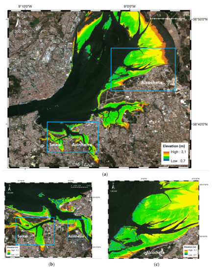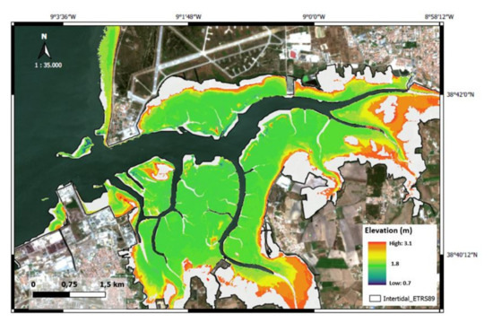 The generated intertidal elevation models for the Tagus estuary and for the Bijagós are presented in Figure 9 and Figure 10, respectively. The maximum and minimum elevations are limited by the highest and the lowest tide recorded in the image data set. A constant tidal height for the entire covered area was assumed, to simplify the calculations. An accurate pixel-wise tide model can be derived and used in the logistic function to improve the estimated pixel height [18,23,24,33,61], but that is beyond the scope of this study. The highest/lowest tide values were, respectively, 4.08 m/1.34 m for the Bijagós and 3.35 m/0.72 m for the Tagus estuary. Satellite images were acquired at 11:21 UTC for both study areas, limiting the measurement of the lowest annual tide, with values that could reach 0.3 m or 0.4 m, for Tagus estuary and Bijagós, respectively [32]. This limitation is not specific to this particular method, since any methodology that uses multitemporal satellite images will be conditioned by the satellite’s passage time [18,19,25,31,33].