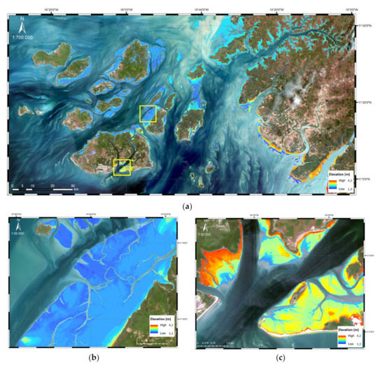 (a) Bijagós intertidal model estimated from 19 S2 images (red: 4.2 m and dark blue: 1.3 m). The two yellow rectangles highlight different intertidal areas; (b) zoom on the intertidal model estimated for the Bijagós (top right rectangle in (a)—sandy beaches); and (c) zoom on the intertidal model (bottom left rectangle in (a)—mostly mangroves and mudflats [37,38]).