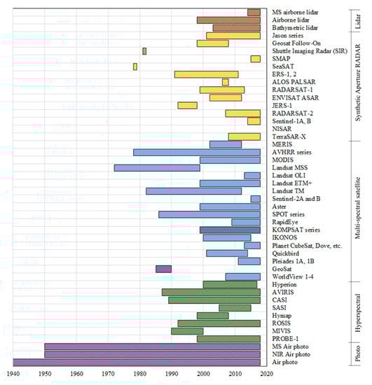 The combination of active and passive sensors within a range of spectral, spatial, and temporal resolutions, and the ability to develop complimentary data information, has also increased the variety of wetland data products derived (e.g., References [,,]) using data conflation frameworks. The combination of information streams from different sensors has allowed users to characterise wetland attributes that may be difficult to identify using single sensors. For example, the authors of Reference [] were able to identify ephemeral vernal pools by combining PALSAR L-band SAR, laser return intensity from lidar data, and a Digital Elevation Model (DEM). In another study [], vernal pools were identified using colour infrared aerial photography and lidar data. Typically, vernal pools are difficult to identify using single remote sensing technologies and therefore many of these are missed within wetland classifications []. This is due to occlusion of the ground surface by tree canopies, particularly problematic for optical imagery but can be sensed using lidar, an inability to quantify standing water within vernal pools using lidar data, observed using SAR, and an inability of lidar and SAR for measuring tree species and texture, which can be mapped using optical imagery. Combining sensors using data conflation methods improves the accuracy with which these are identified []. Other examples include: peatland microtopographic and moss species monitoring using a hydrological framework based on high spatial resolution lidar and IKONOS optical imagery [], classification of bogs and fens using RADARSAT-2 with quad-polarimetry and Landsat OLI multi-spectral imagery within an object-based image analysis framework [], invasive species identification using multiple spectral imagers such as MIVIS, AISA Systems, GeoEye, and Worldview-2 [], and overland flooding using a combination of Landsat TM, SPOT, and RADARSAT-1 [], among others. With increased data availability and long-term data acquisition periods [] (Figure 2), data conflation has become the state-of-the-art in remote sensing wetland science.