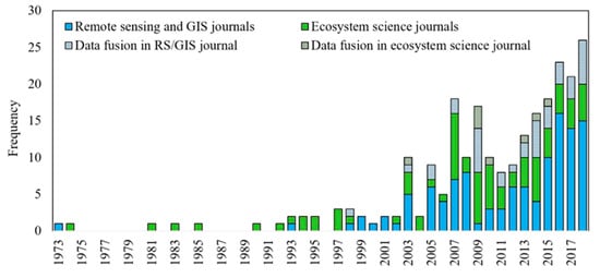 Frequency of articles published in peer-review journals that compared remotely sensed data with measured wetland attributes over time. Articles were categorised into either remote sensing (RS) and geographic information system (GIS) journals or in ecosystem science journals and the year of publication. Also included is the frequency of publication of multiple sensor-conflation methodologies within remote sensing and ecosystem science literature (n = 241 journal articles including accuracy statistics examined). As of the writing of this article, a total of 1701 articles published in English use remote sensing to examine global wetland characteristics (Web of Science).