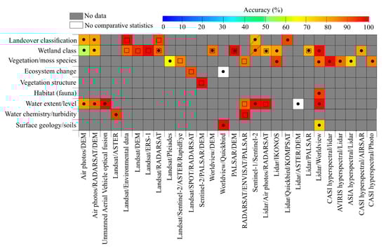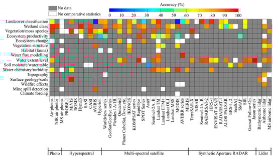Feasibility of 46 commonly used remote sensing platforms (x-axis) for 16 wetland application areas (y-axis) following Ramsar Convention guidelines (Ramsar Convention on Wetlands, 2018) directed to boreal wetlands, and presented as average validation accuracy (R2 or users’ accuracy). This is determined as percent correspondence with field data found within the literature. Grey represents applications that were not discussed (per system) in the literature reviewed, and white represents applications that were described but did not contain suitable statistics for comparison in this review. Remote sensing systems are organised within each category (e.g., multi-spectral satellite) from highest to lowest pixel resolution.