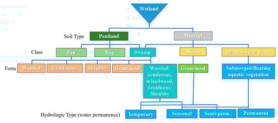 Hierarchical classification framework for wetland class, soil type, form, and hydrologic type (water permanence) for boreal and foothills biomes of Canada (adapted from References [,]).