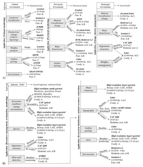 Use of remote sensing optimal sensors for common wetland-related applications of (A) government agencies, including National (left column), Provincial (middle column), and Municipal governments (right column), and (B) industry and non-governmental organisations (NGOs) end-users across various scales. Parentheses represent the minimum mapping unit for 2 x 2 pixels (in hectares and square meters for small areas) per sensor, followed by cost of acquisition ranking (Free, Moderate cost, High cost), and accuracy ranking, where A = highest accuracy, B = moderate accuracy, C = lowest accuracy.