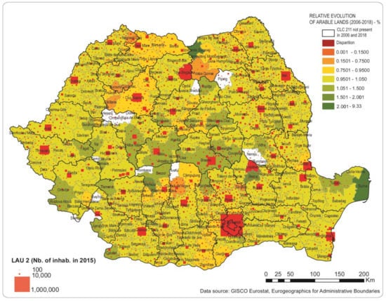 The consistent reduction of arable lands due to a permanent need of big cities for development is observed around Bucharest (Ilfov County), Cluj-Napoca, Iasi, etc. There are also examples of a substantial increase in arable land on account of the reduction of other land-use/land cover classes such as vineyards (PoduTurcului–Bacau). On the other hand, the influence of the financial infusion from the EU in the case of some traditional agricultural areas based on widespread field crops can be observed (Figure 5). This is the case in Tulcea, Sascut–Bacau, Iasi and Sfantu Gheorghe–Covasna. Unfortunately, the structural changes within the areas with a high percentage of arable land (pseudo-LAU1 of Timis, Arad, Slobozia, Ianca–Braila and Saveni–Botosani), affected by consistent internal transformation based on modern farming practices (land merging into large plots), are very difficult to detect.