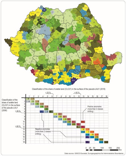 After 1990, during the post-communist period, Romania passed through complex social, economic and political transformations which led to radical background changes within some important fields such as land property and agricultural land exploitation. Some of these transformations were investigated at global [1], European [2] and national levels using Corine Land Cover (CLC) datasets [3,4,5]. The CLC project largely fulfills the expectations of researchers and other users [6], having two main advantages: it provides a seamless geometry usable for macro-regional studies and an internal classification of the land use/cover categories that allows time traceability of changes, for a reasonable period (1990–2018). The facility of tracking the changes in the use of the land has allowed a multitude of applications and correlations between CLC datasets and different parameters [7,8,9]. There is an intense use of the CLC datasets for local or regional studies; however, the intermediate scales are systematically neglected by other researches [10,11,12]. This is why we consider that the proper scale of CLC use for policy design should be an intermediate one, an administrative geometry that fits the needs of analysis somewhere between the local level and the Nomenclature of Units of Territorial Statistics (NUTS3) delineation [13].